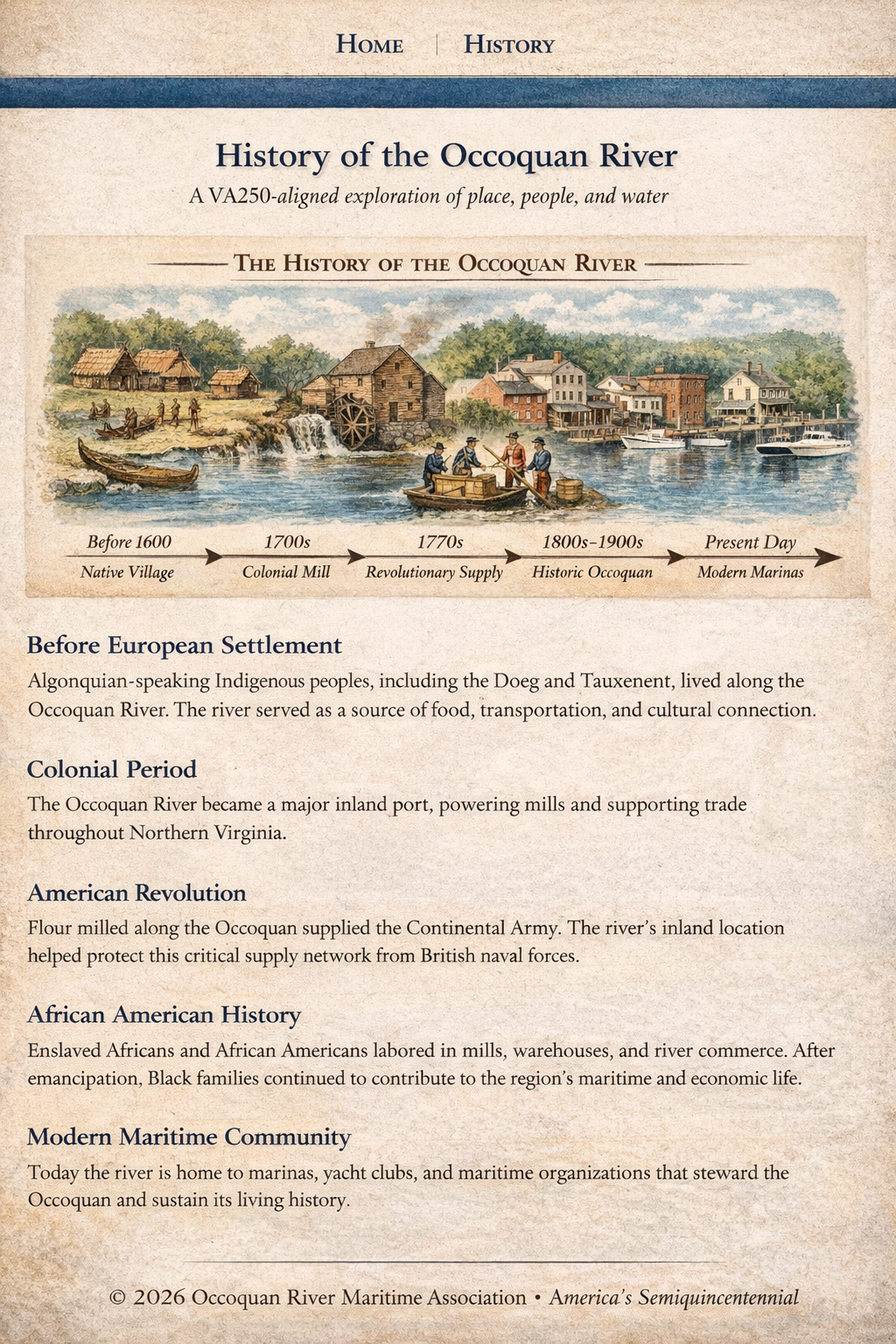 Today the river supports Prince William Marina, Occoquan Harbor Marina, Belmont Bay Harbor Marina, Holly Acres on the Water, and a network of yacht clubs and maritime organizations that sustain both working and recreational boating.